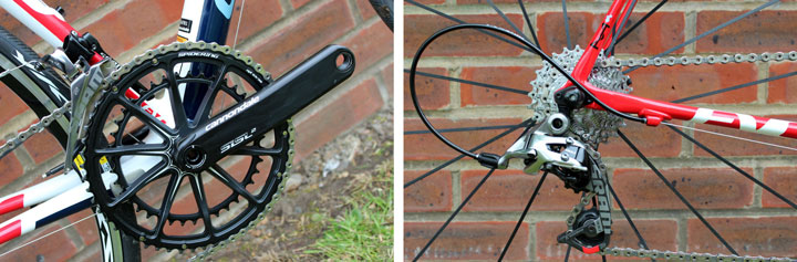 За быстрое и четкое переключение передач отвечает 22-скоростная трансмиссия, представленная системой Cannondale Hollowgram SiSL2 с 2-мя звездами 50-34 зубьев, а также кассетой на 11 скоростей SRAM PG-1170 с зубьями 12-26. Шоссейник оснащен передней перекидкой SRAM Red 22 Yaw, тогда как задняя — SRAM Red 22, с манетками-автоматами, которые совмещены с тормозными рычагами Dual Control. Эффективно затормозить и своевременно замедлиться позволят ободные (клещевые) SRAM Red. Подобные тормоза демонстрируют отличную работу в дождливую погоду, не говоря уже о сухой, когда велосипед останавливается в момент. Данная тормозная система считается одной из лучших на сегодняшний день среди всех моделей-аналогов. Каретки велосипеда — интегрированные, модификации Cannondale Alloy PF30 BB Cups.